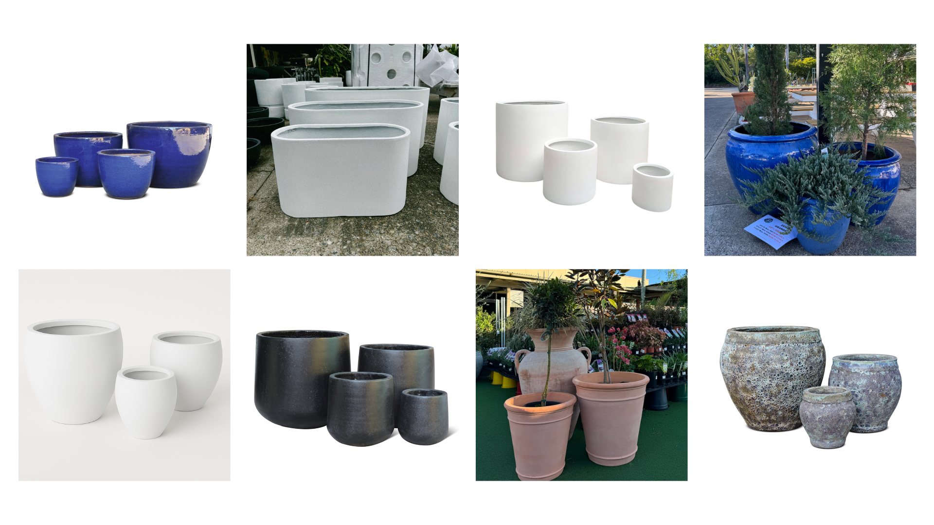 Variety – The options are almost endless, Outdoor pots, Glazed pots, fibre glass pots, light weight pots, cement pots, Atlantis pots, terracotta pots, Garden pots, planters, Large pots, office pots, modern and stylish pots, please tell me when to stop!